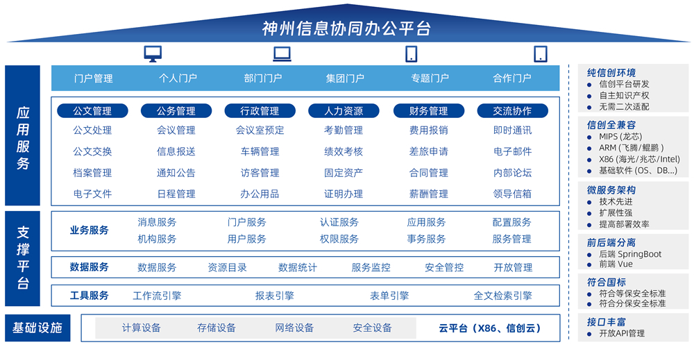基于微服務(wù)應(yīng)用架構(gòu)設(shè)計(jì)的一體化辦公平臺(tái),采用前后端分離的開發(fā)模式,支持在龍芯、鯤鵬、飛騰、兆芯等芯片的國產(chǎn)服務(wù)器安裝部署,能夠?yàn)槠髽I(yè)提供豐富的協(xié)同功能應(yīng)用,滿足客戶多樣化、場景化、個(gè)性化的應(yīng)用需求,助力中大型與集團(tuán)企業(yè)客戶實(shí)現(xiàn)數(shù)字化轉(zhuǎn)型升級(jí)。