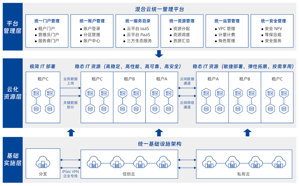 面向已部署多云、信創基礎設施的行業用戶,提供自助化、自動化的云服務快速交付服務。管理企業內部多個數據中心的物理、虛擬資源,以及容器、私有云、公有云資源,并對以上資源進行混合編排,提供基礎軟件和應用軟件的自動化部署服務,以及云資源的全生命周期管理。