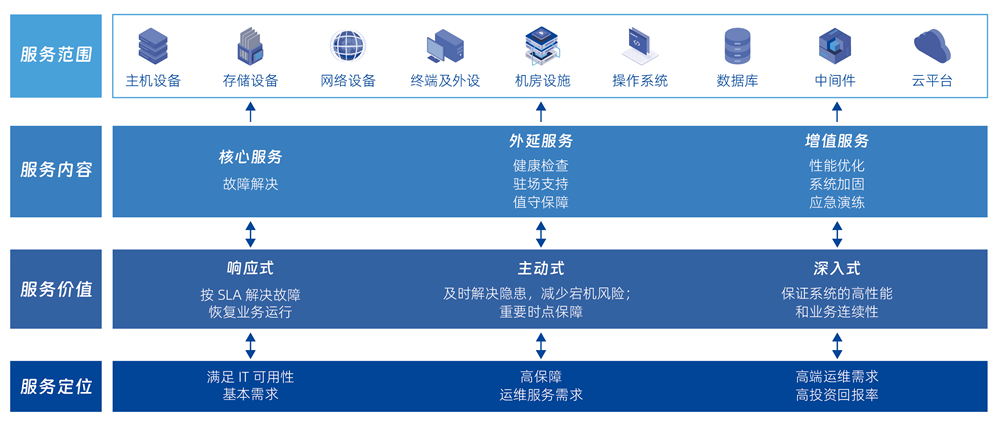 硬件維保(MA)服務:提供主機、存儲、網絡、終端及外設、機房設施等硬件設備故障解決、健康檢查、駐場支持、值守保障、系統升級加固、應急演練等服務。軟件維保(MA)服務:提供操作系統、數據庫、中間件、存儲軟件等軟件產品故障解決、健康檢查、性能優化、系統升級等服務。