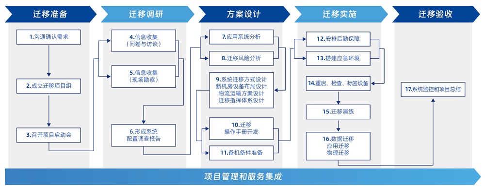 幫助客戶進行數據中心的各類遷移服務,包括傳統數據中心及新一代云數據中心的 IT 基礎設施設備遷移、系統遷移、數據遷移、應用遷移、同城災備/雙活、異地容災等各類場景遷移。設備包含主機、存儲、網絡、服務器、云平臺、數據庫、中間件、應用、災備系統等各類軟硬件。遷移服務通過制定遷移策略和計劃,組織高效、準確地執行遷移,并在既定等停機窗口內完成數據中心的搬、遷、建、管、謀等過程。 一站式集成遷移服務能力:新一代數據中心規劃、建設、優化、容災、遷移、物流、備件、運維