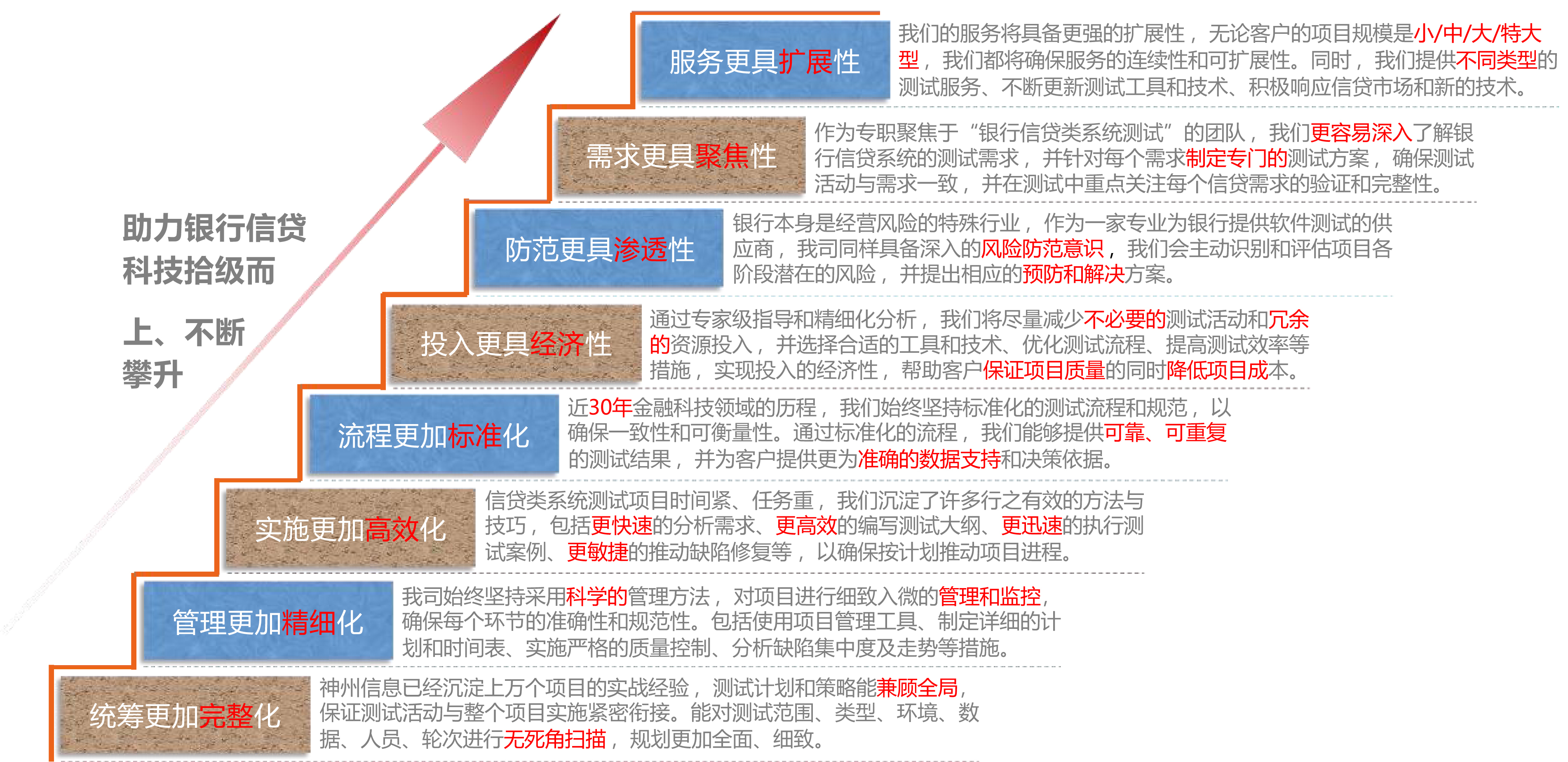 我們將以快速響應能力為導向,及時處理銀行在信貸類系統測試過程中遇到的問題和需求變,以確保項目的成功實施、符合客戶預期。